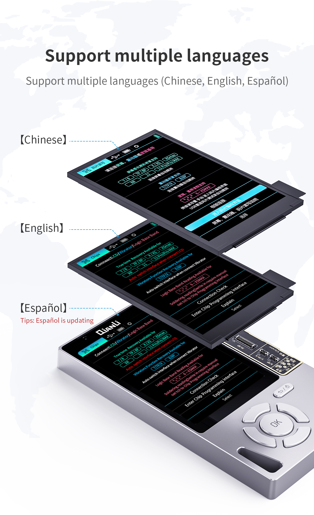 Chinese, English, Español)